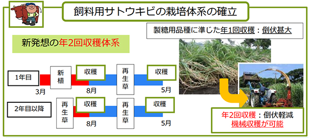 2. 年2回収穫という新しい発想で、多収かつ収穫作業性の高い飼料用サトウキビの栽培体系を構築した。