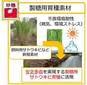 3.飼料用サトウキビの研究過程で得られた多収性や病害抵抗性の育種素材は、不良環境耐性の高い安定多収の製糖用サトウキビの育種に活用されている。