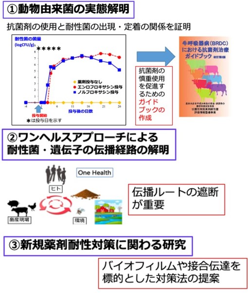 医療及び獣医療における薬剤耐性菌/耐性遺伝子の拡散は公衆衛生上、大きな問題となっている。畜産環境において抗菌剤はよく使用されるが、使用と薬剤耐性菌/耐性遺伝子の定着や拡散の関係の解明及び環境を介した拡散について科学的なデータを示し、抗菌剤の慎重使用や環境対策をとることは重要である。