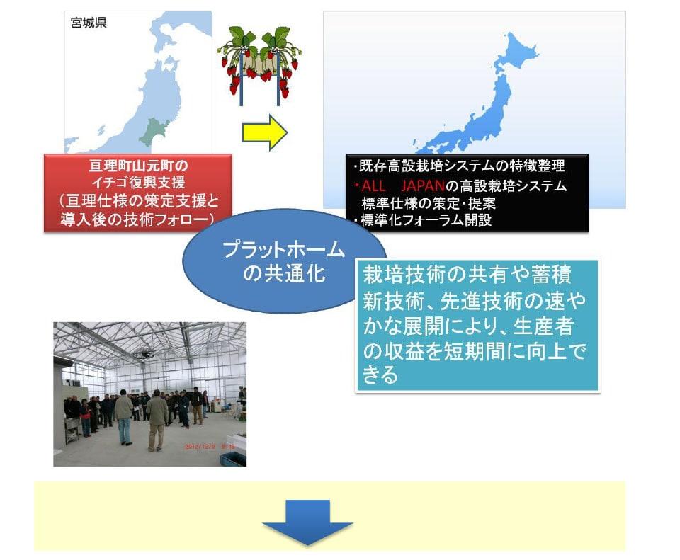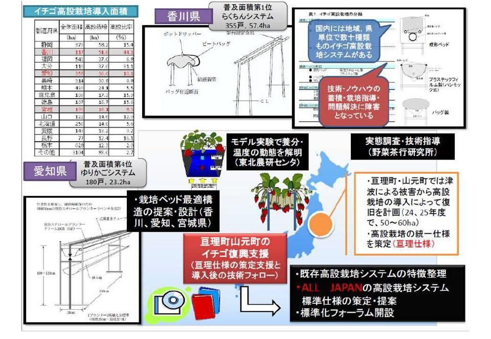 東日本大震災の津波によって大きな被害を受けた東北地方最大のイチゴ産地である亘理町、山元町では高設栽培の導入による生産の復旧を計画しています。イチゴ高設栽培システムについては、民間企業や県、JAなどが開発した多数のシステムが国内に存在し、栽培技術の共有や蓄積、栽培指導や問題解決を行う上で大きな障害となっていることが指摘されています。