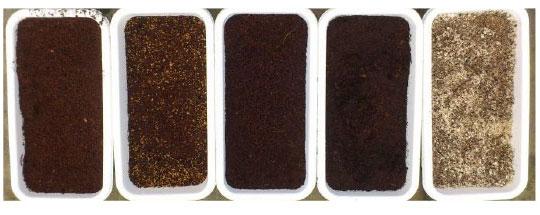 供試培地(左からヤシガラ、ヤシガラ+鹿沼土、調製済ヤシガラ、ピートモス、バーミキュライト・パーライト)