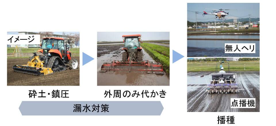 砕土・鎮圧、外周のみ代かきによる漏水対策を行って無代かきにすることにより、鉄コーティング直播を一層省力化できます