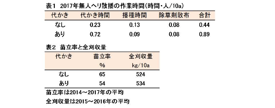 無代かきにより、代かき作業時間が約0.5時間/10a短縮され(表1)、苗立率が約10%向上しました(表2)。全刈収量は変わりませんでした。