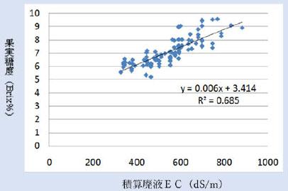 図2 開花~収穫まで廃液EC値の合計と果実糖度の関係(品種桃太郎はるか)