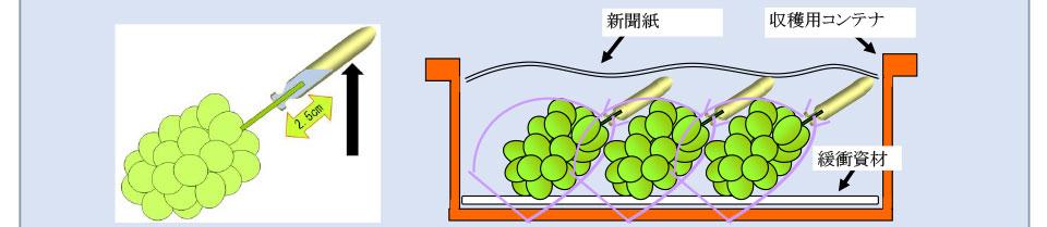 - (3)収穫用コンテナの底面に緩衝資材を敷き、果房を並べる。