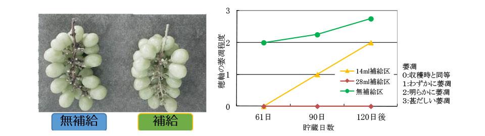 収穫後、穂軸の先端にプラスチック容器(商品名:フレッシュホルダー)を装着し、水分を供給することで穂軸と果粒の鮮度を維持することができる。