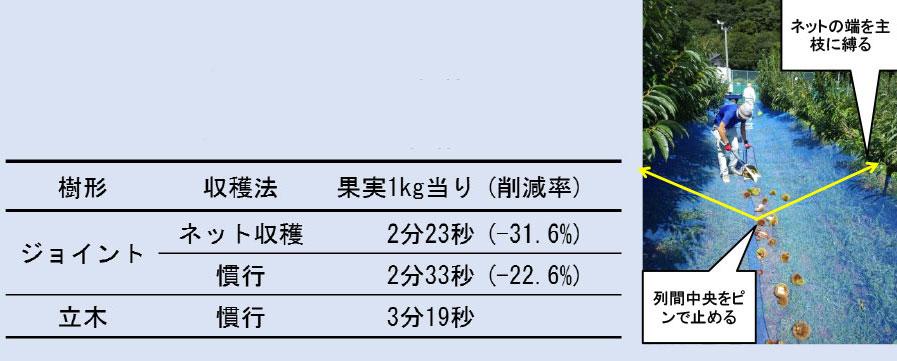 クリは省力栽培可能な果樹ですが、収穫作業は非常に労力がかかります。ジョイント栽培は直線的な管理が可能となり、さらにネットを設置して収穫しやすい場所に果実を集めることでさらなる省力化が可能となります。