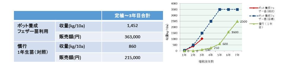- (3)定植初年収量:9品種平均36kg/10a(最大137kg~最小4kg)
