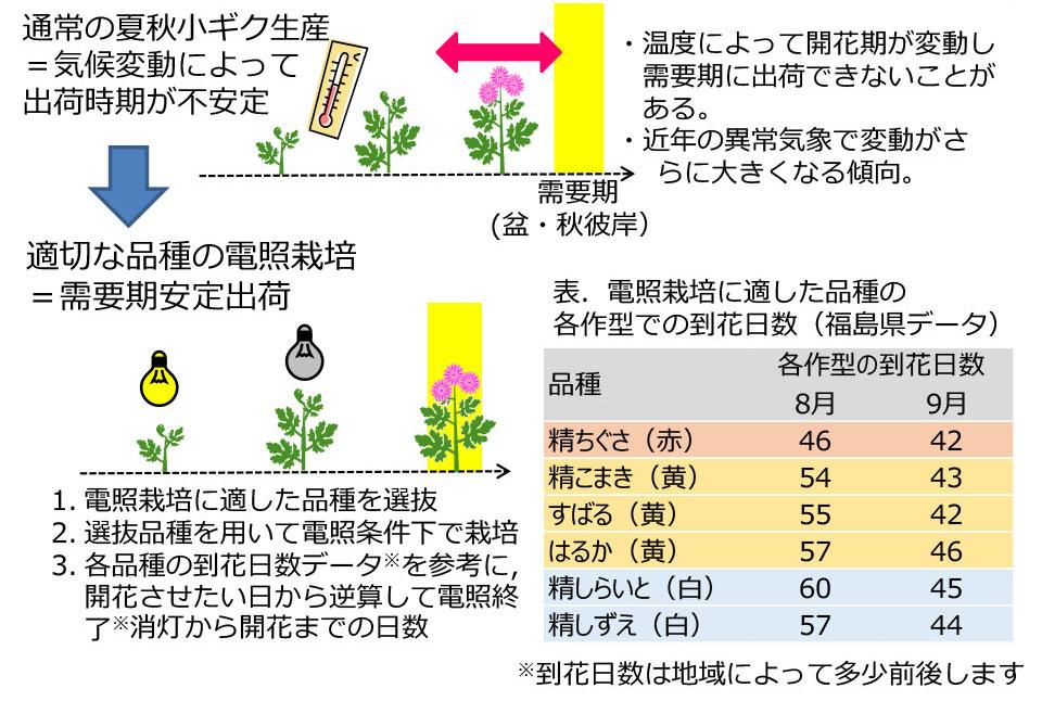 - 適切な品種を用いた電照栽培による夏秋期の露地小ギクの開花調節技術