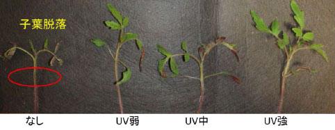 播種後16日目のトマト苗。UVなしでは葉こぶ症により子葉が脱落し本葉が萎縮(感受性品種の場合)。ハイブリッド装置でUVを付加することで健全な苗が生産可能。