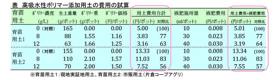 高吸水性ポリマーの費用および増加する液肥の費用を加えても、通常の用土に比べ、費用としては2割~4割削減することが可能と試算されました。