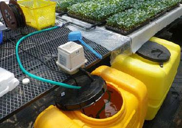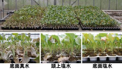 定植1週間前のブロッコリー苗に0.3%塩水を1週間かん水することで、ブロッコリー苗に耐干性が付与されることが分かっていますが、底面給水システムを用いることで省力的に塩水かん水を行うことができます。