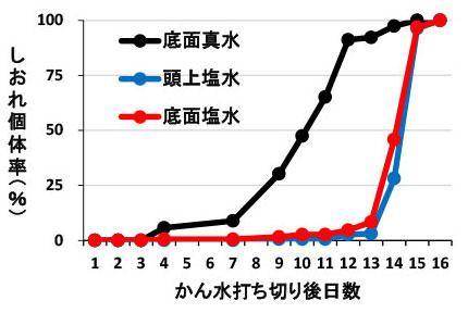真水及び塩水かん水打切り後のブロッコリー苗しおれ個体率の推移