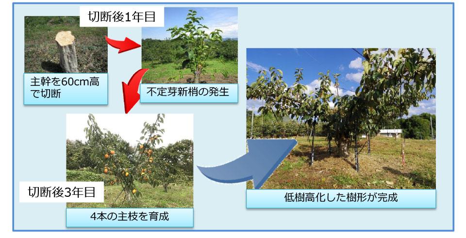 →収穫作業時間が25%減少 - 主幹切断後3年目から収穫が可能、樹冠拡大も早い