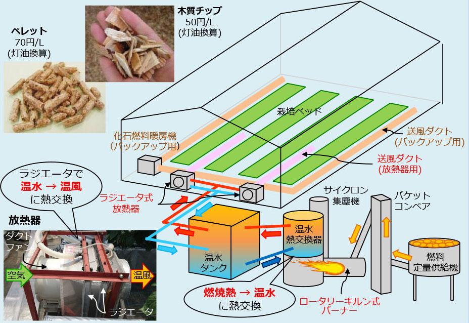 - ハウス暖房エネルギーの5割程度を化石燃料から地域の木質チップやペレットで代替でき、木質チップ5割代替の場合で燃料代を15%程度削減できます