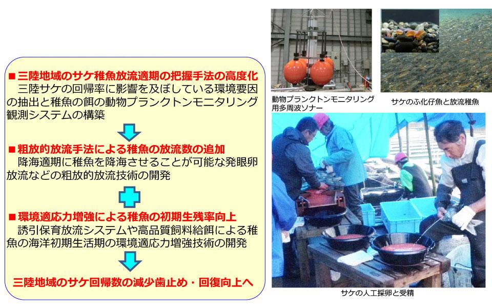 - 三陸の重要な漁業資源であるサケの複合的放流技術