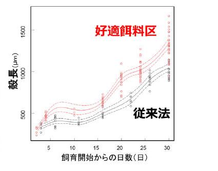 - 針型珪藻を与えた区(好適餌料区)では従来法と比較して生長速度が20%、生残率が30%向上