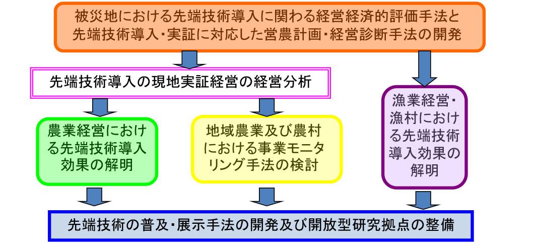 先端技術が早期に農業経営・漁業経営に導入されることで被災地の経営改善を支援することを目的に、先端技術の現地実証地区における農業経営や地域農業の現状の把握・分析を行い、将来の地域農業像や農業経営像、さらに、漁村や漁業経営の姿を提示する。