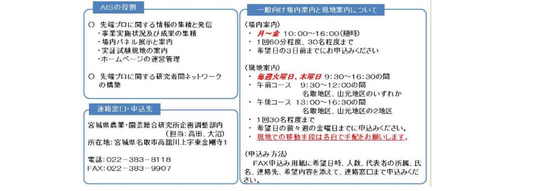 宮城県農業・園芸総合研究所内に拠点を置いて、生産者、農業関係団体、技術普及関係団体、学校関係者、研究者等幅広い方々に、本実証研究に関するパネル展示・映像展示等及び研究実証地の現地見案内を行っています。