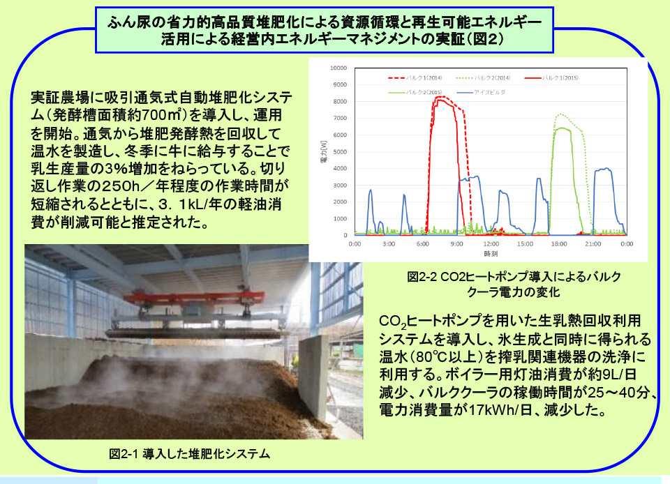 - 吸引通気式自動堆肥化システムを導入し、省力的な堆肥化と発酵熱の利用が可能となった。ヒートポンプによる生乳熱回収利用により灯油消費量とバルククーラ負荷が低減された(図2)。
