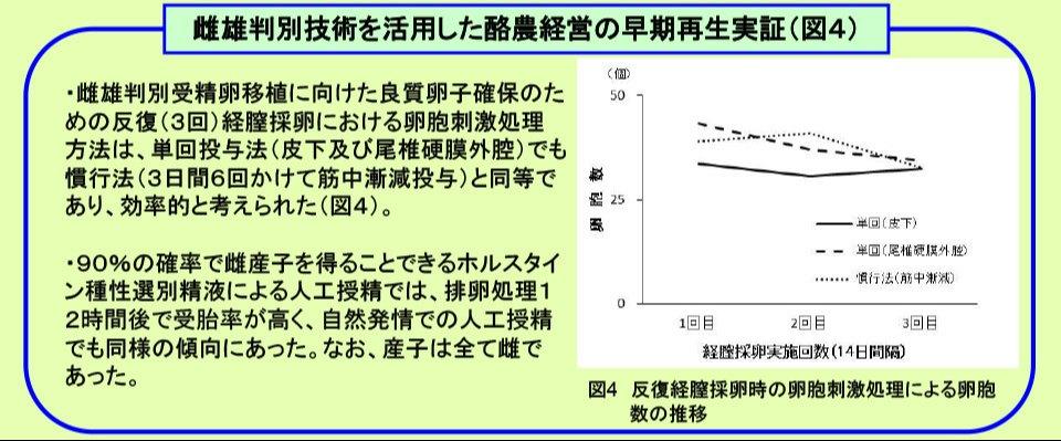 - 性選別精液による受胎率の高い人工授精実施時期が、排卵処理後12時間であることを明らかにした。慣行より効率的で同等の良質卵子を確保できる卵胞刺激処理方法を明らかにした(図4)。