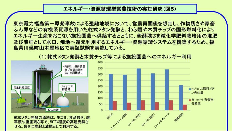 - 乾式メタン発酵システムについて、処理材料別のガス発生量を明らかにし、日処理量10t以上で経済的に成り立つことを示した。木質チップの乾燥とバーナーへの定量供給を可能とし、燃焼熱によるハウス暖房実証を行っている。除染農地におけるスイートコーン、バレイショ、サトイモの実証栽培では、RCsは検出限界以下で、十分な品質・収量が得られた(図5)。