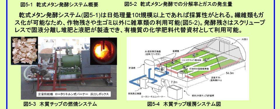 - 効率的な乾式メタン発酵技術、発酵原料等の収集・調製・貯蔵技術、発酵残さの肥料調製利用技術、固形燃料の製造・利用技術等を実証し、エネルギー・資源循環型営農システムの経営的・エネルギー的評価を行う。