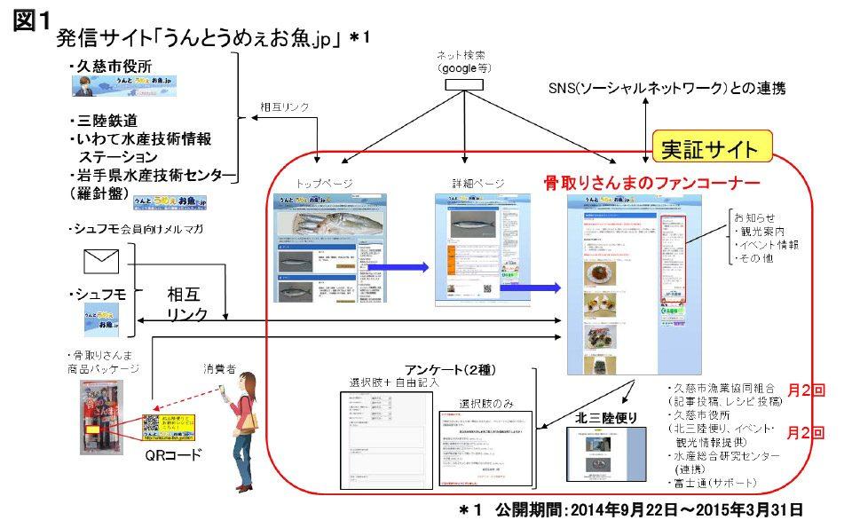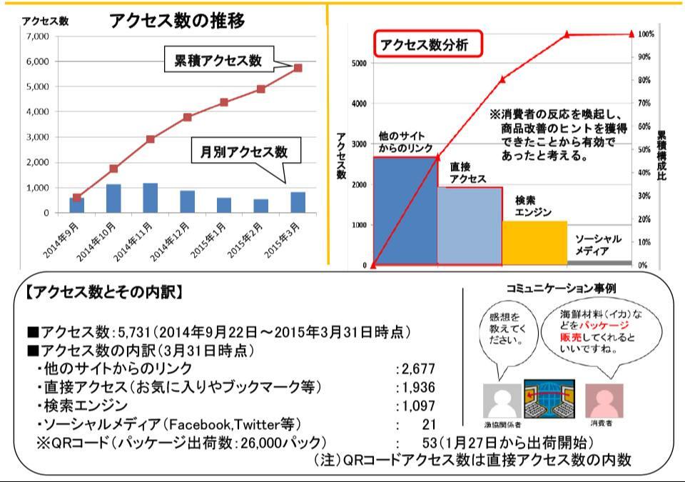 - 実証サイト全体では5,731アクセス(実証期間:2014年9月22日~2015年3月31日)があり、このうち相互リンクしているサイト(三陸鉄道、久慈市役所、シュフモ)のHPから2,558アクセスがあり、有力なHPからのリンクが有効と考えられる。また、イオンが全国販売する「骨取りさんま」に係るコミュニティーページ「骨取りさんまのファンコーナー」では2,735アクセスがあったが、商品貼付のQRコードからのアクセスは1%未満であった。一方、消費者の反応を喚起し、商品改善のヒントを獲得できるような事例もできており、情報発信活動は有効であったと考える。
