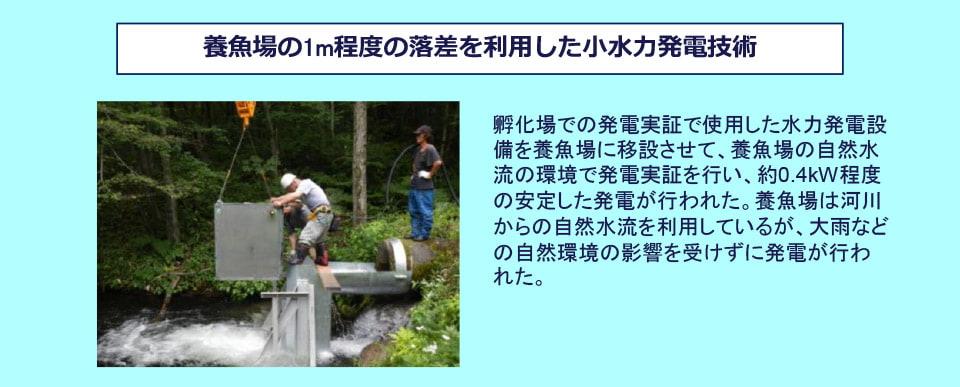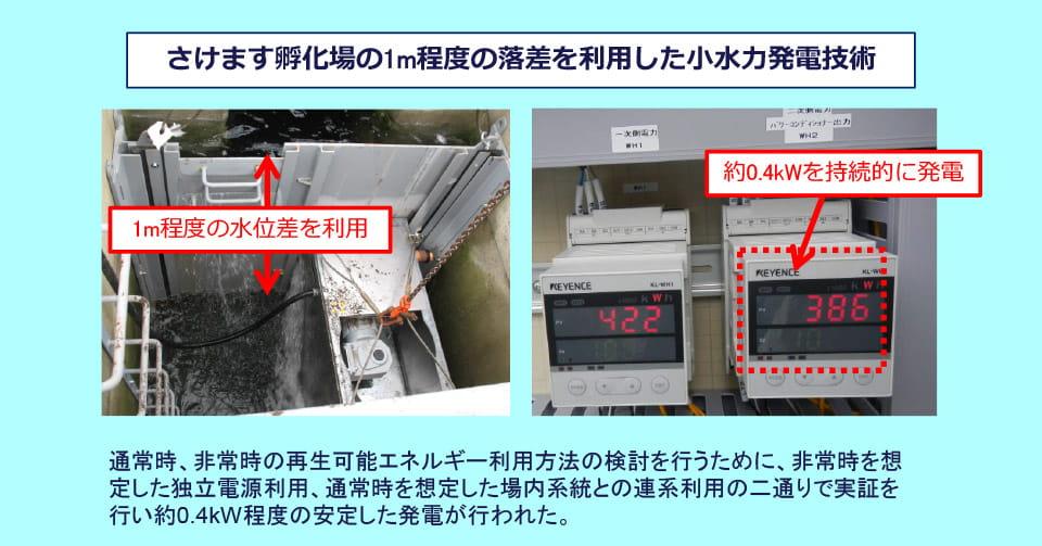 - 孵化場と養魚場での発電実証では約0.4kWの安定した発電が行われた。
