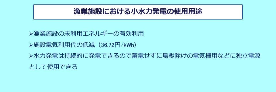 - 今後、漁業地域で小水力発電を検討する際に参考資料として活用できるよう研究成果を整理した資料を作成した。