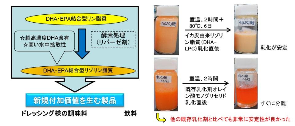 注)DHA:ドコサエン酸のことで、健脳機能、抗アレルギー、抗腫瘍、抗メタボ機能が知られている。リン脂質:リンを分子内に持つ脂質で、生体親和性が高く、結合している脂肪酸が利用され易い脂質である。乳化機能を有する。乳化剤:油脂を水に分散させる働きを持った物質。リゾリン脂質:リン脂質に結合している二つの脂肪酸のうち、一つを除去して、脂肪酸を一個にしたもの。より苛酷な条件でも乳化能を維持し、結合している脂肪酸が一層利用され易い形態の脂質である。