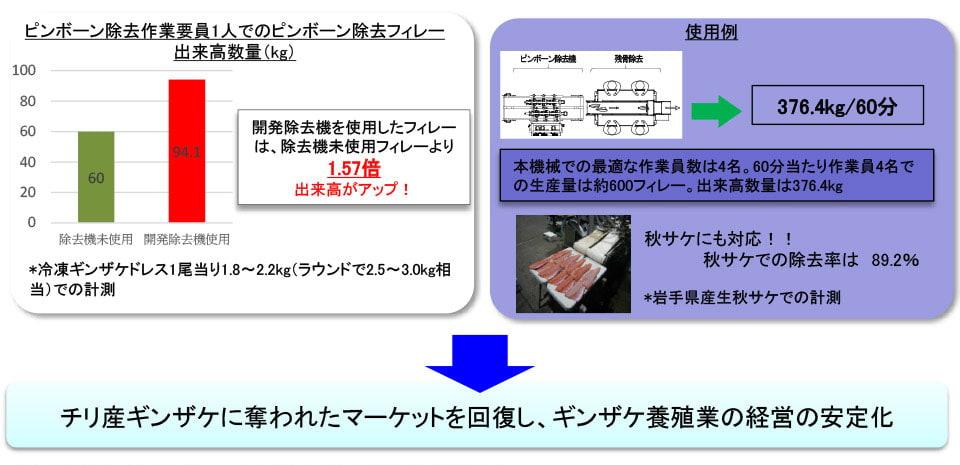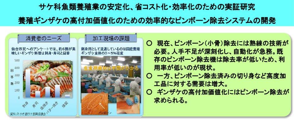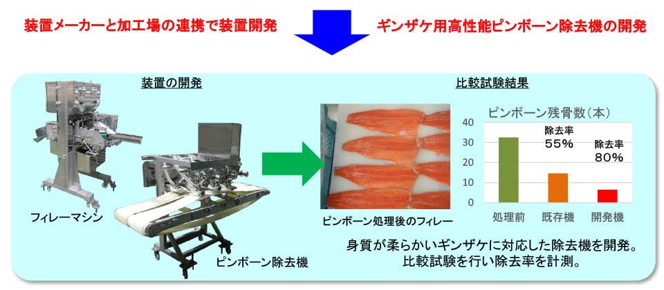 - 刺身用フィレーなどの高付加価値化のため、ギンザケ用のピンボーン(小骨)除去装置の開発を行い、水産加工場で利用できる省力化したシステムを開発する。