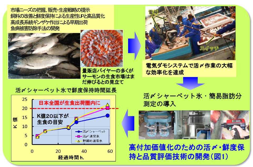 - 魚の消費が全国的に減少傾向がある中、生鮮生食サケの消費は伸びており、ギンザケを生食用サケとして流通させる有効性が確認された。また、活締め+シャーベット氷を用いることにより、生食用として輸送に2日間かけられること,電気ダモシステムにより活締め作業効率を大幅に向上させられることが明らかになった(図1)。