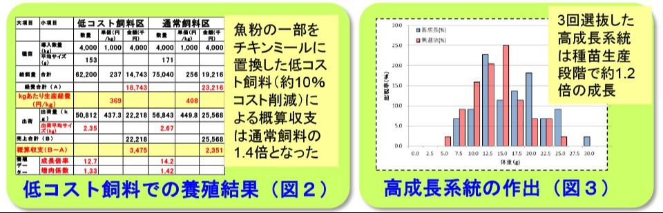 - 収量に影響を及ぼす成長や歩留まりを向上させるための高成長魚の作出。稚魚期(淡水)から海面での育成期を通じて生残率に影響を及ぼす病害の防除。