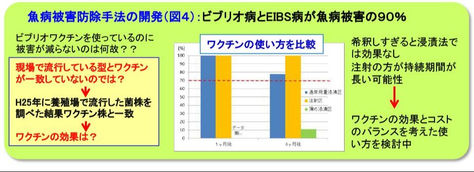 - 高成長系統魚は,種苗生産段階で1.2倍程度の成長向上(図3)。EIBSウィルスに対する簡便な検査法を開発し,幼魚期に一度感染して免疫を獲得した種苗を判別可能になった。さらに,ワクチンを試作中。ビブリオ病ワクチンの使用方法を再検討し,注射法の方が効果期間が長い傾向(図4)。