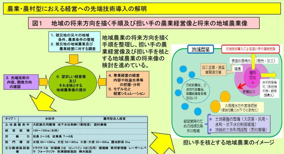 - 被災地復興に向け、先端技術展開事業により進められている開発技術の導入には、地域の将来動向と今後の農業経営像や漁業経営像の明確化、及び経営や地域における導入効果の明確化が不可欠である。