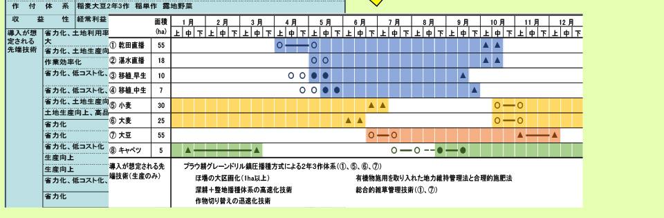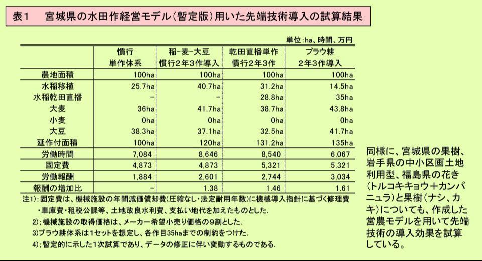 - 宮城県・土地利用型営農技術の実証経営における収支や作業時間等の実態および実証データから作成した営農モデル(暫定版)を用いて、プラウ耕―グレンドリル方式による2年3作輪作体系技術の導入による経営体への効果を示した(表1)。同様に、宮城県の果樹、岩手県の中小区画土地利用型、福島県の花き(トルコキキョウ+カンパニュラ)と果樹(ナシ、カキ)の営農モデル(暫定版)を作成し、経営体への先端技術の導入効果を試算した。