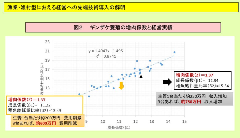 - 宮城県・ギンザケ養殖業の実証研究を対象に、ギンザケ養殖業の経営実績データから作成した経営モデルを用いて、ギンザケの成長倍率と稚魚量に対する給餌量の関係から増肉係数を導き、先端技術の導入によって増肉係数が低減した場合の経済的利益を定量化した(図2)