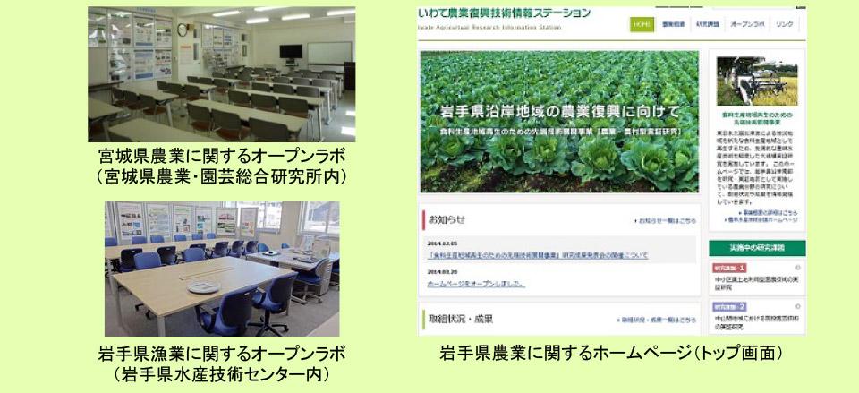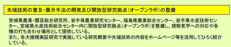 - 宮城農業・園芸総合研究所、岩手県水産技術センターなど、参画している5研究機関にオープンラボを整備し、実証研究内容のパネル展示、視察者用パンフレット作成、先端技術に関するホームページ開設を行い、生産者、団体等に対して、先端技術の紹介を行った。