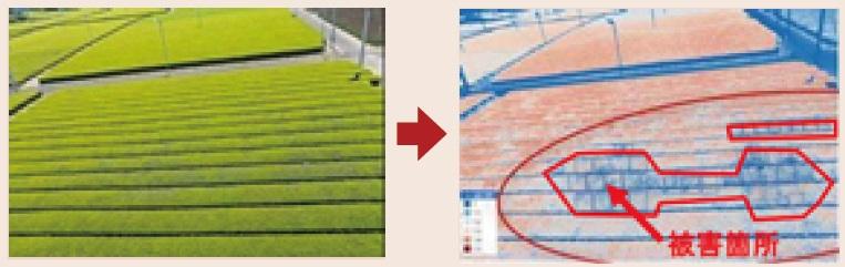 - ドローンによる空撮、RGB解析することで、病害虫(ナガチャコガネ)の園内被害箇所を特定