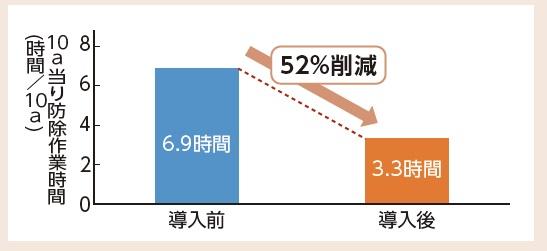 - 乗用型防除機自動防除操縦システムを装備した乗用型防除機を導入することで、手作業で行う動力噴霧器と比べて防除に要する年間作業時間を52%削減