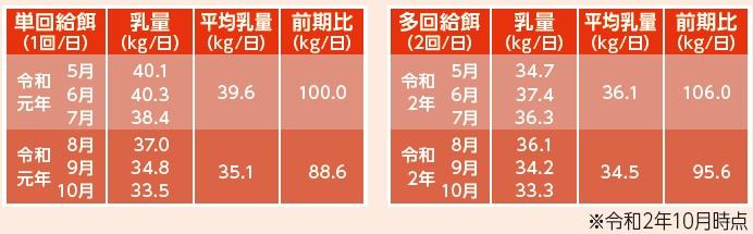 - 暑熱期の搾乳牛に対する給餌回数を、1日1回の単回給餌から1日2回の多回給餌にしたことで、平均搾乳日数が200日から250日に延長して平均乳量は減少したが、乳量減少量は前年同期の4.5kg/日(11.4%)から1.6kg/日(4.4%)へと7.0%減少した。