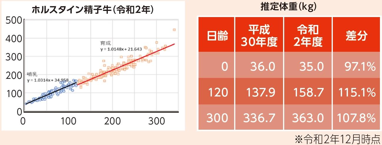 - スマート哺育技術により、哺乳期の発育が改善したことで推定体重が120日齢で115.1%、300日齢で107.8%と向上した。