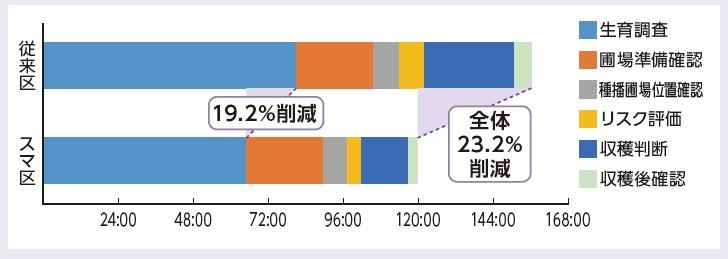 - 生育調査作業の負荷は約19%軽減(対照区対比)、圃場巡回作業全体としては約23%軽減