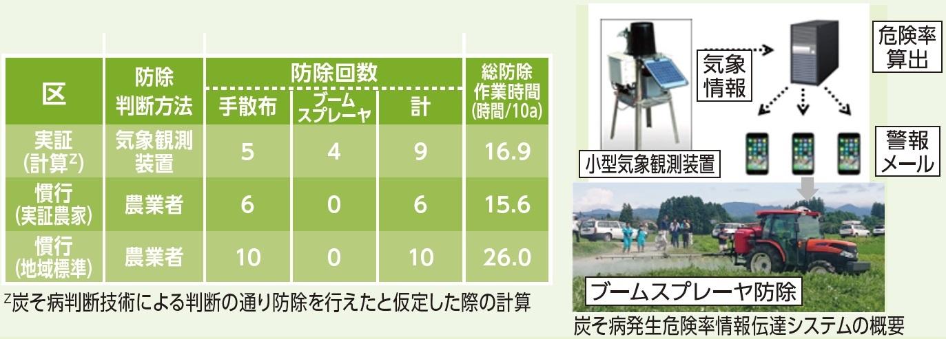- 小型気象観測装置を用いたすいか炭そ病防除判断技術と、自動操舵システムとブームスプレーヤを組み合わせて防除を行った場合、総防除作業時間が約35%減少(26時間/10a→16.9時間/10a)すると試算された。