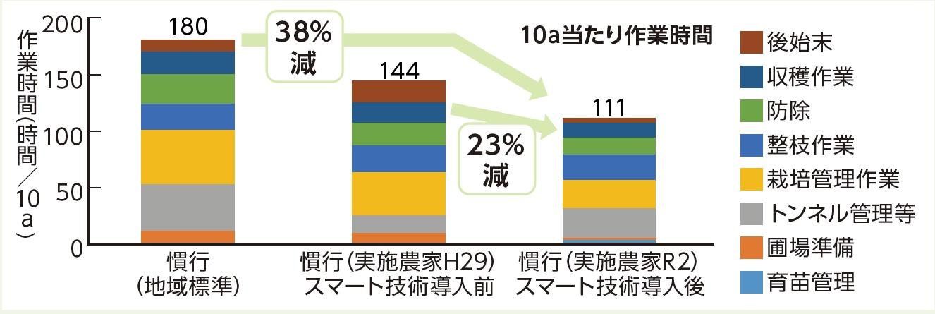 - 各技術の導入により、すいかの栽培体系全体の労働時間が(実証農家の慣行H29)対比で約23%減少し、144時間/10aから111時間/10aとなった。