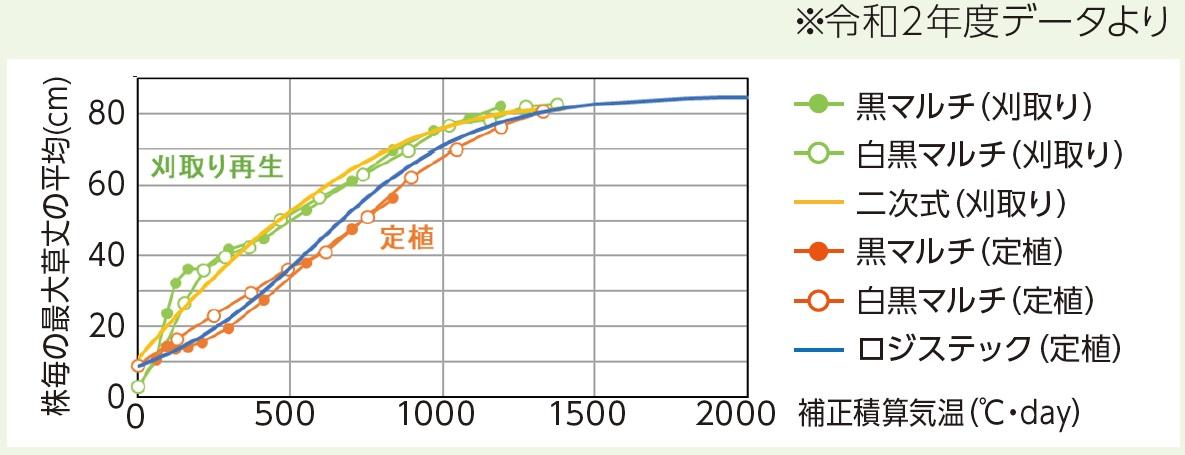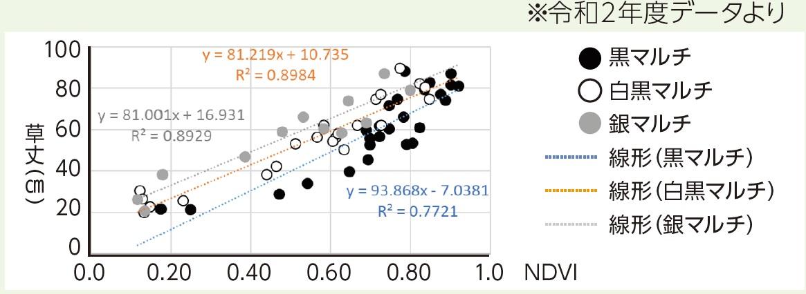 - エリア毎の平均NDVIと草丈から推定した調整後の株重には高い相関があり、生育の把握に利用可能であり、マルチ色ごとに検量線を準備する必要がある。
