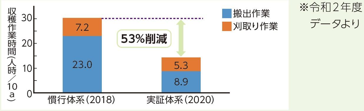 - ネギ収穫機を用いた収穫作業体系では、刈取り作業は26%削減、搬出作業を含めた場合は53%削減された。