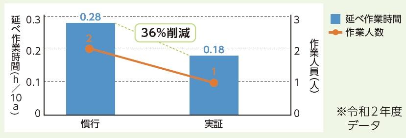 - 収穫後の整地をロボットトラクタと有人トラクタの協調作業で行い、作業人員を2名から1名に、延べ作業時間を36%削減。