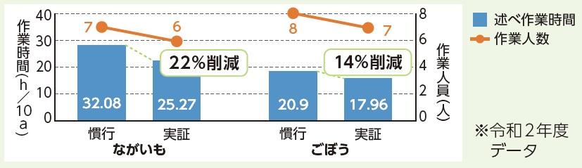 - 自動操舵トラクタ(収穫)にトレーラーを牽引するロボットトラクタ(運搬)を追従させることで、オペレーターを1人減らし、延べ作業時間をながいもで22%、ごぼうで14%削減。